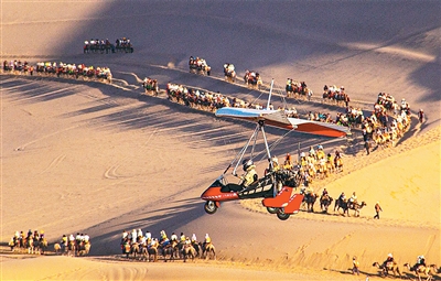 近年來,在甘肅省敦煌市鳴沙山月牙泉景區(qū)運(yùn)營的敦煌“飛天”通用航空項目,為游客提供低空飛行器旅游服務(wù),讓游客乘坐直升機(jī)、動力滑翔機(jī),從空中欣賞大漠綠洲和月牙泉美景,沉浸式體驗敦煌獨特魅力。圖為7月3日,游客乘坐滑翔機(jī)空中俯瞰敦煌大漠風(fēng)光。王斌銀攝(人民視覺)