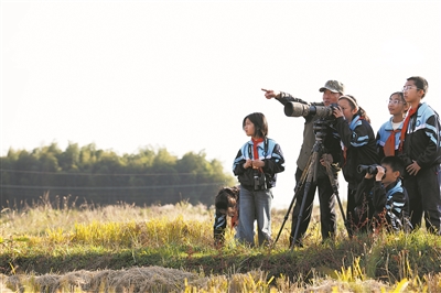 圖為在位于安徽省池州市的十八索省級(jí)自然保護(hù)區(qū),茅坦小學(xué)的學(xué)生在野生鳥類保護(hù)志愿者的帶領(lǐng)下用相機(jī)記錄鳥類。