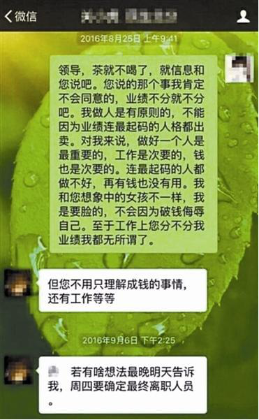 微信中還顯示,關(guān)某某在微信中多次以談“業(yè)績”為由,約女員工“出來見面聊聊”。對于如此扭曲的上下級關(guān)系,有評論稱,本是靠能力吃飯的行當(dāng),最后將“業(yè)績籌碼”演繹成“陪睡游戲”。除了反胃和憤怒,更多的是對這個(gè)時(shí)代的拷問。