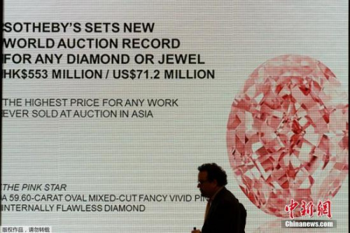 中新網(wǎng)4月5日電 據(jù)外媒報(bào)道,近日,重達(dá)59.60克拉、一顆被稱為“粉紅之星”的罕見鉆石在香港拍賣的價(jià)格超過了7100萬美元,刷新了全球鉆石的拍賣紀(jì)錄。