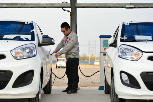 資料圖片:4月13日,河北省清河縣一家新能源汽車公司的工人在為新生產(chǎn)的電動汽車充電。新華社發(fā)