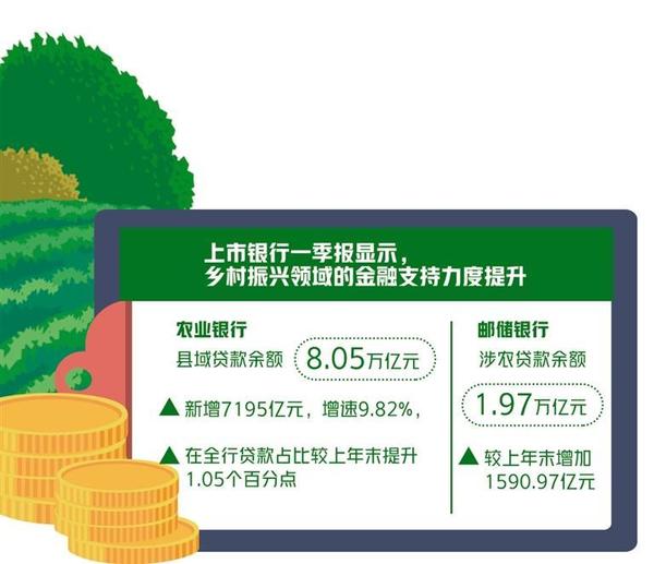近日,各家上市銀行一季報先后披露完畢。從公開數(shù)據(jù)看,中國農(nóng)業(yè)銀行、中國郵政儲蓄銀行等在鄉(xiāng)村振興領(lǐng)域的金融支持力度持續(xù)提升。其中,農(nóng)業(yè)銀行縣域貸款余額達8.05萬億元,新增7195億元,增速9.82%,增量創(chuàng)歷史同期新高,在全行貸款占比較上年末提升1.05個百分點。郵儲銀行涉農(nóng)貸款余額1.97萬億元,較上年末增加1590.97億元;建成信用村38.69萬個,評定信用戶超千萬戶,主動授信白名單客戶貸款本年凈增366.20億元。