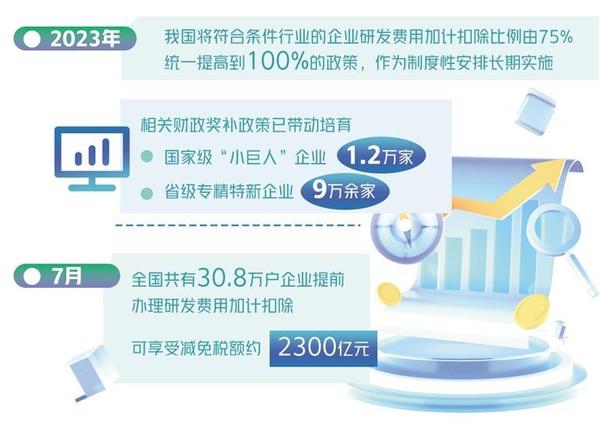 “為切實保證這一新的惠企政策落實到位,稅務(wù)部門依托稅收大數(shù)據(jù)篩選符合條件的企業(yè),定向開展政策精準(zhǔn)推送和宣傳輔導(dǎo),確保企業(yè)‘知曉政策’;會同科技部門及時發(fā)布《研發(fā)費用加計扣除政策執(zhí)行指引2.0》,細化政策口徑,確保企業(yè)‘會用政策’;第一時間優(yōu)化升級征管系統(tǒng),改進電子稅務(wù)局功能,讓納稅人‘足不出戶’即可快捷辦理,確保企業(yè)‘用好政策’?!眹叶悇?wù)總局新聞發(fā)言人、辦公廳主任黃運介紹。從7月份政策落實情況看,全國共有30.8萬戶企業(yè)提前辦理研發(fā)費用加計扣除,可享受減免稅額約2300億元。