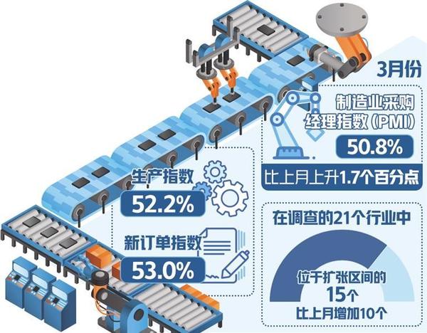 “3月份PMI指數大幅回升,且重回榮枯線之上,既有季節(jié)性因素影響,也表明經濟回升向好態(tài)勢進一步明確。”國務院發(fā)展研究中心研究員張立群表示。