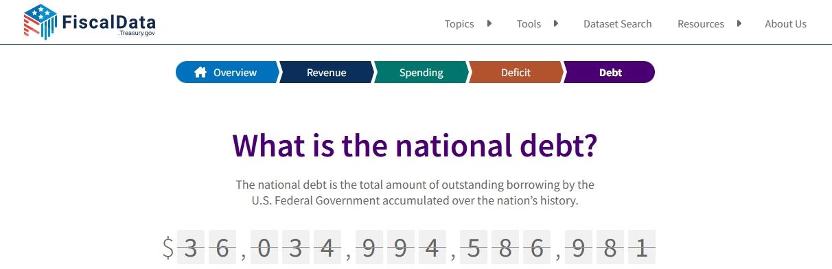 △美國財政部下屬的財務數(shù)據(jù)網站當前數(shù)據(jù)顯示,美國聯(lián)邦政府債務總額已達到36.034萬億美元。