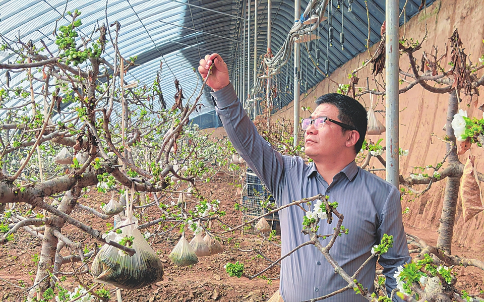 婁淵斌正在檢查車?yán)遄訕溟_花情況。本報記者暢雪攝