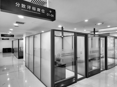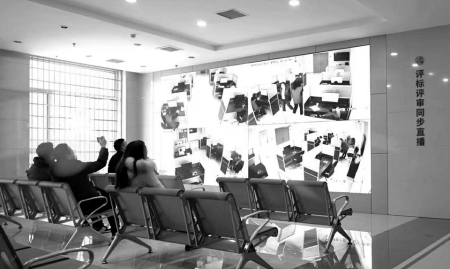 參觀完一層大廳后,工作人員將媒體觀摩團(tuán)帶到了四層一個(gè)全封閉的區(qū)域——評(píng)標(biāo)區(qū),隨機(jī)抽取的專家會(huì)在這里進(jìn)行評(píng)標(biāo)工作。代表們首先是被一系列的科技防范“硬措施”所震撼,人臉識(shí)別身份核驗(yàn)機(jī)、金屬探測(cè)門防范冒名頂替,通信設(shè)備存儲(chǔ)柜、文件傳送智能機(jī)器人阻斷不必要的溝通,軌跡定位卡、電子呼叫系統(tǒng)、電子門牌等技術(shù)的應(yīng)用實(shí)現(xiàn)了對(duì)交易人員身份類別權(quán)限的精準(zhǔn)管控……還有全方位、超高清、永久保存的監(jiān)控設(shè)備,實(shí)時(shí)對(duì)外直播的電子大屏,實(shí)現(xiàn)了嚴(yán)密管控、處處震懾。
