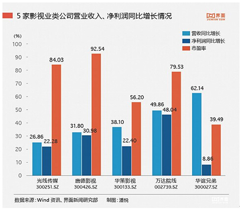 據(jù)界面報道,根據(jù)財報顯示,華誼兄弟2015年影視娛樂版塊營業(yè)收入較上年同期相比增135.80%,達到28.32億元,營業(yè)成本較上年同期增長135.80%,達到16.62億,毛利率較上年減少了3.05%,達到41.35%。在報告期內(nèi),公司上映的主要是《奔跑吧兄弟》《天將雄師》《梔子花開》、《命中注定》《尋龍訣》《老炮兒》等16部,電影的總票房約43億。