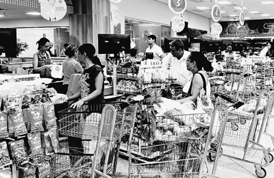 由于巴西通貨膨脹攀升導致消費不振,民眾購物更趨謹慎。圖為在里約熱內(nèi)盧一家超市,當?shù)孛癖娫诓少徤畋匦杵贰S浾?顏 歡攝