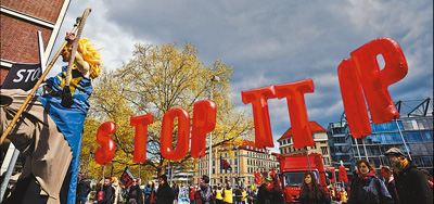自2013年歐盟和美國啟動《跨大西洋貿(mào)易與投資伙伴關系協(xié)定》(TTIP)談判以來,歐洲國家的反對和抗議聲不絕于耳。圖為今年4月,德國民眾走上街頭抗議TTIP談判。