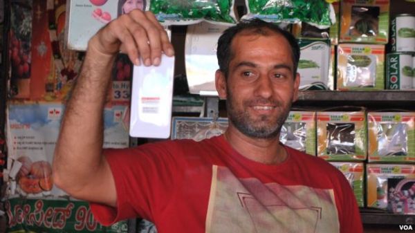 印度邁索爾一位集市攤主展示他的小米手機(jī)。(美國(guó)之音電臺(tái)網(wǎng)站)