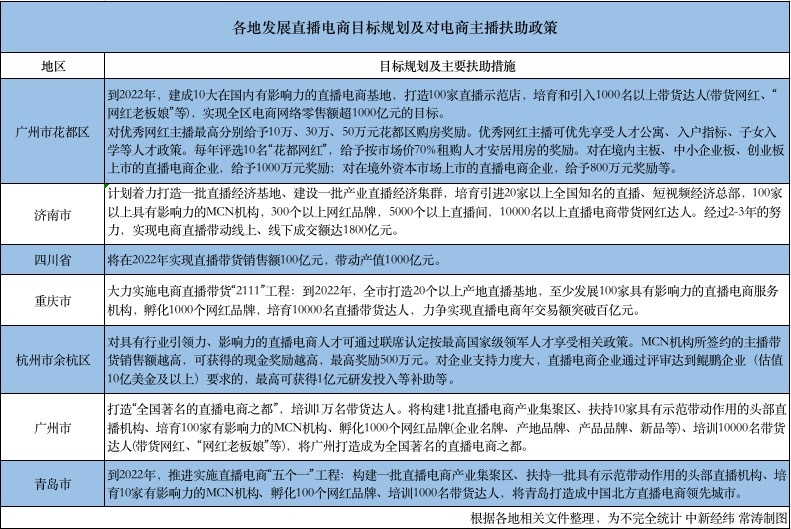 各地發(fā)展直播電商目標(biāo)規(guī)劃及對電商主播扶助政策