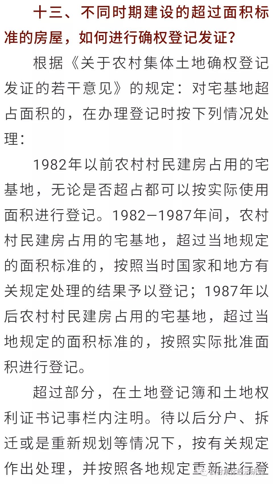 十七、非本村村民依法取得的宅基地可以登記嗎?以下情況可以進(jìn)行確權(quán)登記:“非本村集體成員因扶貧搬遷、地質(zhì)災(zāi)害防治、新農(nóng)村建設(shè)、移民安置等按照政府統(tǒng)一規(guī)劃和批準(zhǔn)使用宅基地的,在退出原宅基地并注銷登記后,應(yīng)依法確定新建房屋占用的宅基地使用權(quán)。”1982年前,非農(nóng)業(yè)戶口居民(含華僑)合法取得的宅基地或因合法取得房屋而占用的宅基地,范圍自1982年至今未擴(kuò)大的,可按實(shí)際使用面積予以確權(quán)登記;1982—1999年止,非農(nóng)業(yè)戶口居民(含華僑)合法取得的宅基地或因合法取得房屋而占用的宅基地,按照批準(zhǔn)面積予以確權(quán)登記,超過(guò)批準(zhǔn)的面積在登記簿和權(quán)屬證書附記欄中注明。