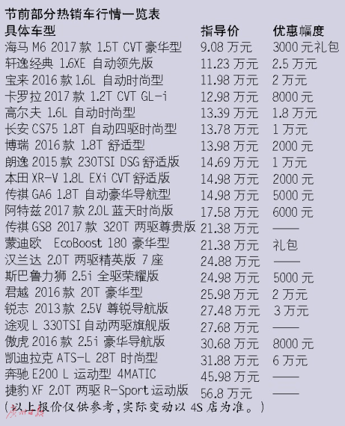 有經(jīng)銷商表示,由于今年春節(jié)來得比較早,目前大部分汽車品牌還沒有接到新一年的市場促銷政策,因此市場上還沒有出現(xiàn)大力降價(jià)促銷的情況,基本保持原有優(yōu)惠幅度。記者留意到,節(jié)前最后半個(gè)月,也有部分車型有較大的讓利幅度,但多為在廣州本地銷量較為一般的高端車或豪華車,如凱迪拉克、英菲尼迪等部分車型,優(yōu)惠基本超過6萬元以上;進(jìn)口大眾途銳的優(yōu)惠高達(dá)10萬元以上;樓蘭也有高達(dá)7萬元優(yōu)惠。而熱銷車型,如卡羅拉,近期只有6000~8000元優(yōu)惠,比此前的1.2萬~1.6萬元優(yōu)惠縮水不少;朗逸近期也只有8000~1萬元讓利,比此前也縮水近一半。經(jīng)銷商建議,如果不急著節(jié)前買車,等到節(jié)后看看也不遲。