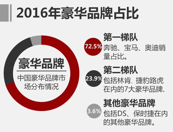 而包括捷豹路虎、凱迪拉克、雷克薩斯、沃爾沃、英菲尼迪、林肯和謳歌組成的豪華品牌第二梯隊(duì),2016年總銷量為520,354輛,占整個(gè)豪華車市場23.9%。注:保時(shí)捷品牌定位問題,不算在第二梯隊(duì)內(nèi)。