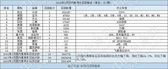 根據(jù)國家質(zhì)檢總局缺陷產(chǎn)品管理中心3月份發(fā)布的召回公告,經(jīng)濟(jì)日報-中國經(jīng)濟(jì)網(wǎng)汽車頻道經(jīng)過匯總、統(tǒng)計,整理出“2018年3月國內(nèi)乘用車召回榜單”。3月,國內(nèi)乘用車市場共有13個品牌發(fā)布15次召回公告,累計召回汽車360774輛,召回數(shù)量同環(huán)比均出現(xiàn)大幅下降,其中同比下降86.17%,環(huán)比下降85.58%。