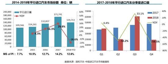 此外,2018年,平行進口汽車銷量出現(xiàn)了5年來的首次下滑,且市場波動明顯。2018年,平行進口車銷量占進口車總銷量的12.6%,達13.97萬輛,同比下滑18.6%,下滑幅度遠超進口車市場整體表現(xiàn)。
