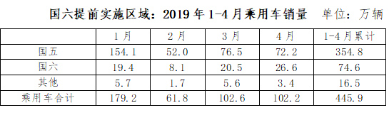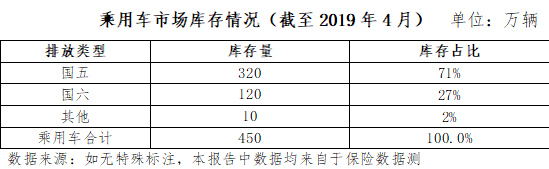 中汽協(xié)發(fā)布的數(shù)據(jù)顯示, 截至2019年4月份,我國乘用車庫銷比達3.1,遠高于行業(yè)1.5的警戒線;行業(yè)整體庫存約450萬輛,國五車輛庫存320萬輛左右(占行業(yè)庫存的71%),其中國六提前實施區(qū)域的國五車輛庫存175-220萬輛(調研企業(yè)推算得出)。