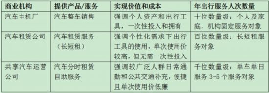 汽車主機(jī)廠、租車公司、共享汽車運(yùn)營公司關(guān)于出行的價(jià)值特點(diǎn)如下圖所示。
