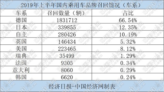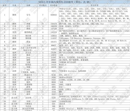 分車系來看,上半年,德系品牌成為召回“主力”,1-6月,德系品牌共召回汽車1831712輛,占召回總量的66.54%,其中寶馬、奔馳分別以830833輛和720479輛的召回?cái)?shù)量,“遙遙領(lǐng)先”其他品牌;而高檔車、超級跑車品牌保時(shí)捷更是召回汽車114337輛,數(shù)量甚至遠(yuǎn)超其2018年80108輛的銷量總和。