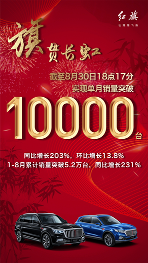 據(jù)紅旗官宣,紅旗品牌單月銷量已突破10000輛,同比增長203%,環(huán)比增長13.8%,至此,1-8月累計實現(xiàn)銷量5.2萬輛,同比增長231%。單月突破10000輛的成績,使紅旗首次躋身月銷萬輛俱樂部。