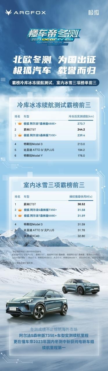 值得一提的是,就在剛剛結(jié)束的2023懂車帝冬測(cè)中,極狐汽車憑借優(yōu)異的表現(xiàn)驚艷國(guó)內(nèi)及海外市場(chǎng)。其中,參賽車型阿爾法S森林版735E+,以368.8的實(shí)測(cè)續(xù)航里程在國(guó)內(nèi)冬測(cè)中取得純電轎車組續(xù)航里程第一名的好成績(jī)。而阿爾法T森林版688E+、阿爾法S森林版735E+在北歐冬測(cè)中,更是以驚人的表現(xiàn),實(shí)力霸榜冷庫冰凍續(xù)航測(cè)試、室內(nèi)冰雪三項(xiàng)榜單前三,向世界展現(xiàn)了中國(guó)新能源汽車的卓越品質(zhì)。