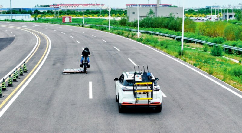 測(cè)試車(chē)輛在天津(西青)國(guó)家級(jí)車(chē)聯(lián)網(wǎng)先導(dǎo)區(qū)封閉測(cè)試場(chǎng)內(nèi)進(jìn)行自動(dòng)駕駛主動(dòng)安全功能測(cè)試 (2024年6月14日攝) 孫凡越攝