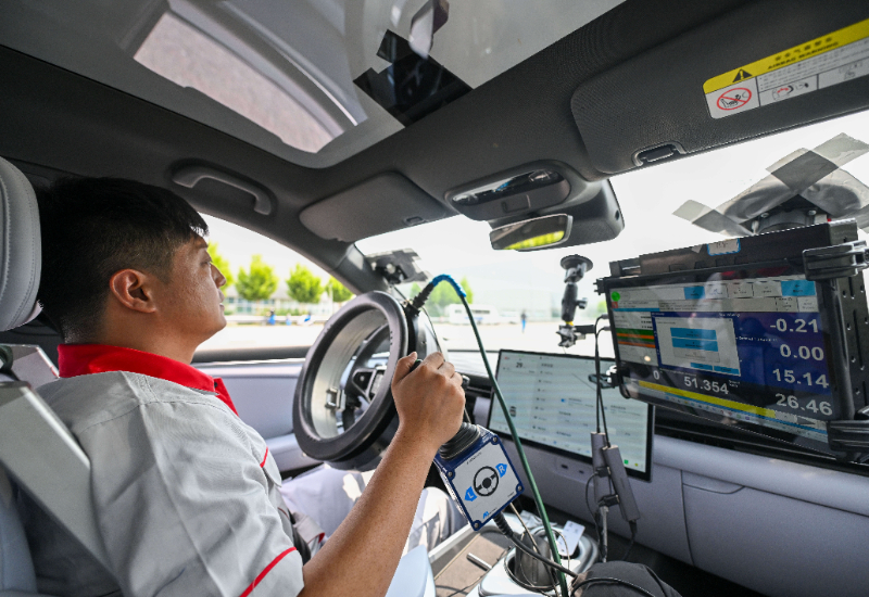 一輛智能網(wǎng)聯(lián)汽車(chē)正在做測(cè)試(6月19日攝)。新華社記者 孫凡越 攝