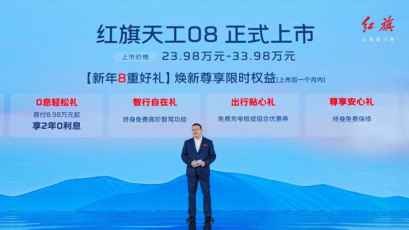 “旗創(chuàng)新高,天工逐耀”,1月7日,在長(zhǎng)春一汽研發(fā)創(chuàng)新基地舉行的“燃動(dòng)冰雪,見證‘相信’——紅旗天工08產(chǎn)品上市發(fā)布會(huì)”上,紅旗智造中大型豪華純電SUV天工08正式上市,以領(lǐng)先技術(shù)和卓越實(shí)力為用戶提供高品質(zhì)出行新選擇?;赝?024年,一汽紅旗銷量突破40萬輛,以強(qiáng)勁增勢(shì)再攀歷史高峰。站在40萬銷量新起點(diǎn),天工08將以進(jìn)取之姿為2025年新征程踏出堅(jiān)實(shí)首步。