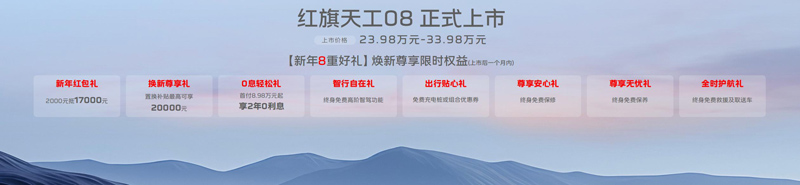 逐夢(mèng)新程,臻享超值。天工08共推出兩驅(qū)和四驅(qū)2種驅(qū)動(dòng)模式共5個(gè)版本供選擇,官方指導(dǎo)價(jià)為23.98萬元-33.98萬元。同時(shí),購買天工08的消費(fèi)者還可尊享“新年8重好禮”限時(shí)權(quán)益,即刻購車可享2000元抵17000元的新年紅包禮;置換補(bǔ)貼最高可享20000元的換新尊享禮;首付8.98萬元起、享2年0利息的0息輕松禮;終身免費(fèi)高階智駕功能的智行自在禮;免費(fèi)充電樁或組合優(yōu)惠券的出行貼心禮;終身免費(fèi)保修的尊享安心禮;終身免費(fèi)保養(yǎng)的尊享無憂禮;終身免費(fèi)救援及取送車的全時(shí)護(hù)航禮。從購車成本到金融方案,再到智駕裝備、質(zhì)量保障等方方面面,紅旗以超值權(quán)益帶來進(jìn)階的價(jià)值體驗(yàn),讓用戶買得舒心、用得安心。