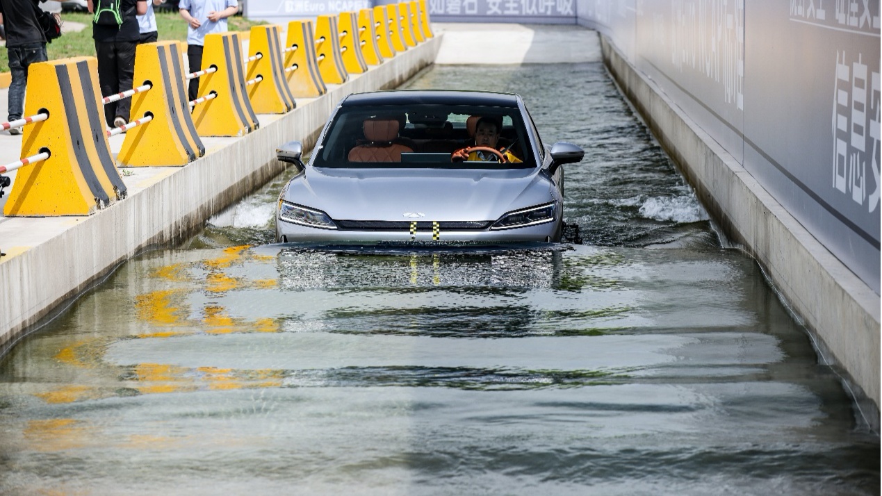 在鐵人三項(xiàng)中,同一輛風(fēng)云A9L模擬極端環(huán)境與事故場(chǎng)景,先經(jīng)過(guò)超越國(guó)家4倍標(biāo)準(zhǔn)的400mm深水區(qū),隨后又以40km/h時(shí)速、40mm重疊量完成刮底實(shí)驗(yàn),并以超越行業(yè)通常做法2.95~3.36倍的55km/h的速度完成中心柱碰。三大實(shí)驗(yàn)后,車(chē)輛動(dòng)力系統(tǒng)完整,電池包無(wú)泄漏且絕緣電阻穩(wěn)定在500Ω/V以上。
