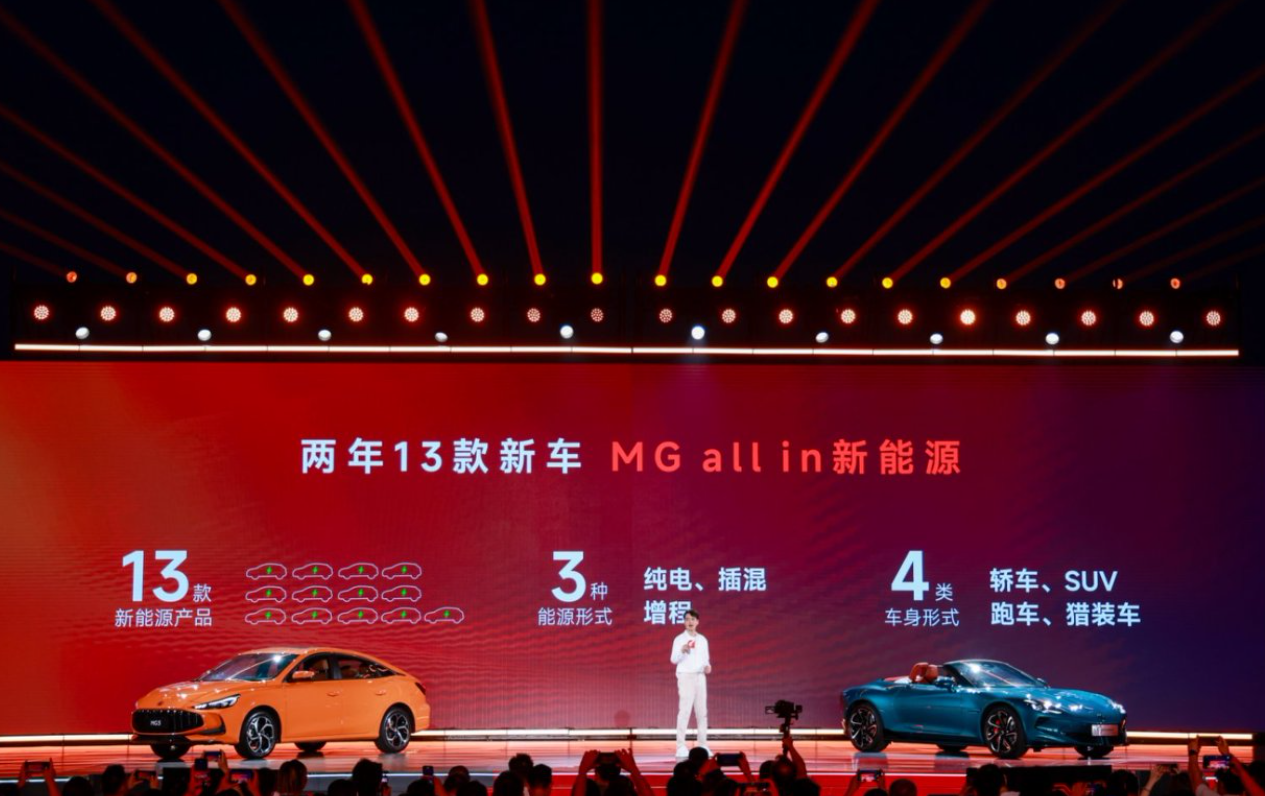 央廣網(wǎng)北京7月1日消息(記者姜鵬)2025年6月30日,上汽集團(tuán)旗下MG品牌舉行了MG Holiday夏日敞開玩暨夏季新車發(fā)布會(huì),現(xiàn)場(chǎng)宣布投資超100億元,加速推進(jìn)All in新能源戰(zhàn)略。按照規(guī)劃未來2年,MG將迎來產(chǎn)品密集投放期,陸續(xù)推出13款新能源產(chǎn)品,覆蓋純電、插混、增程3種新能源形式,涵蓋轎車、SUV、跑車及獵裝車4大車身形式。