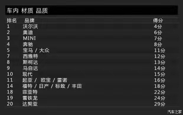 再來看看涂裝品質(zhì)方面,涂裝主要包括車漆亮度與耐腐蝕性。還是老規(guī)矩,得分最低就代表消費者滿意度最高(下同)。沃爾沃的得分為1分,依然占據(jù)榜首的位置,或許排名第二的奔馳為4分,但跟沃爾沃差距有點大。得分最高的則是歐寶,為9分。另外,達契亞也有8分。