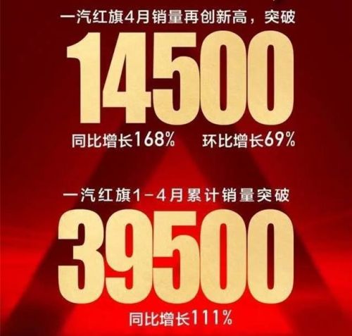 2019年,紅旗品牌累計銷量突破100000輛大關,同比增長200%以上,銷量目標比計劃提前了整整一年。然而,今年年初,一場突如其來的疫情,給全球汽車產業(yè)帶來了巨大的沖擊,大部分車企品牌銷量陷入一片下滑之中,而一汽紅旗卻逆勢而上,實現(xiàn)了超高增長。數(shù)據(jù)顯示,紅旗品牌4月份銷量14500輛,同比增長168%,環(huán)比增長69%;1—4月累積銷量突破39500輛,同比增長111%。