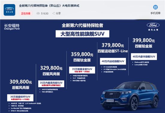 在發(fā)布會(huì)后的線上溝通會(huì)上,長(zhǎng)安福特汽車(chē)有限公司總裁沈鼎文(Steven Armstrong)表示,“全新第六代福特探險(xiǎn)者上市后,將完善長(zhǎng)安福特的SUV產(chǎn)品序列,與銳際、銳界組成核心主流SUV先鋒矩陣,可以充分滿(mǎn)足消費(fèi)者更加多樣的用車(chē)需求”。