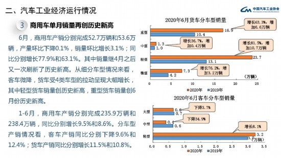 6月,在貨車細(xì)分品種中,與上月相比,輕型貨車產(chǎn)銷繼續(xù)保持增長,微型貨車銷量略增,產(chǎn)量有所下降,其他兩大類貨車品種產(chǎn)銷均呈下降,中型貨車降幅更為明顯;與上年同期相比,四大類貨車品種產(chǎn)銷繼續(xù)保持快速增長。在客車細(xì)分品種中,與上月相比,三大類客車品種產(chǎn)銷均呈增長,其中大型和中型客車增速更為明顯;與上年同期相比,輕型客車產(chǎn)銷保持增長,大型客車小幅下降,中型客車降幅依然明顯。