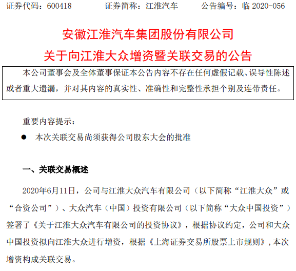 7月21日,江淮汽車(600418)發(fā)布公告稱,公司將與大眾中國投資向江淮大眾進行增資。其中,江淮汽車將向江淮大眾增資12.85億元,大眾中國投資向江淮大眾增資52.17億元。