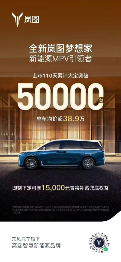 作為嵐圖汽車(chē)的“明星產(chǎn)品”,全新嵐圖夢(mèng)想家的市場(chǎng)表現(xiàn)可圈可點(diǎn)。去年9月19日,全新嵐圖夢(mèng)想家正式上市,不僅助推嵐圖汽車(chē)當(dāng)月銷(xiāo)量突破萬(wàn)輛,且后續(xù)幾個(gè)月延續(xù)熱銷(xiāo)態(tài)勢(shì)。10-11月蟬聯(lián)新能源MPV銷(xiāo)量冠軍,12月單一車(chē)型銷(xiāo)量突破萬(wàn)輛,上市110天累計(jì)大定更是突破5萬(wàn)臺(tái),創(chuàng)造了歷史,也使得嵐圖汽車(chē)坐穩(wěn)月銷(xiāo)過(guò)萬(wàn)的“寶座”,駛?cè)敫哔|(zhì)量發(fā)展快車(chē)道。