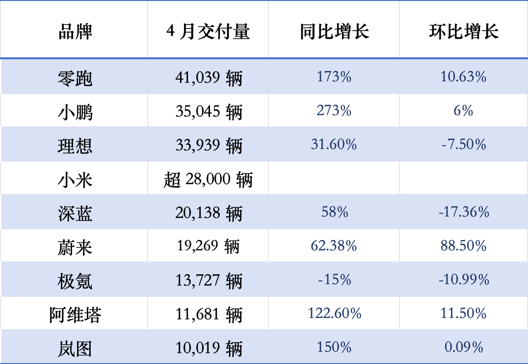 今年以來,零跑、小鵬都保持著較高的增速,4月零跑交付量同比增長達(dá)到173%,小鵬同比增長達(dá)到273%,理想則保持著31.6%的穩(wěn)定增速。