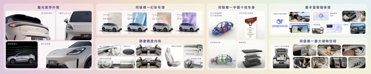 步入“舒嶼座艙”,細節(jié)皆巧思。繽果S以“靜奢棲居美學”為靈感,通過環(huán)抱式布局、貫穿式內(nèi)嵌風幕與柔感貝殼座椅等設(shè)計,營造出沉浸式的舒適氛圍。搭配同級唯一的6揚聲器系統(tǒng)與阿嘉米斯專業(yè)聲場調(diào)校,進一步提升了座艙的靜謐質(zhì)感與聽覺享受。12.8英寸高清大屏內(nèi)置“1+N”靈語AI中樞大模型,深度融合DeepSeek大模型,以更全面的壁紙玩法、八大區(qū)域的方言溝通、更多的智能場景應用,為用戶帶來真正“更懂你的”智能座艙體驗。