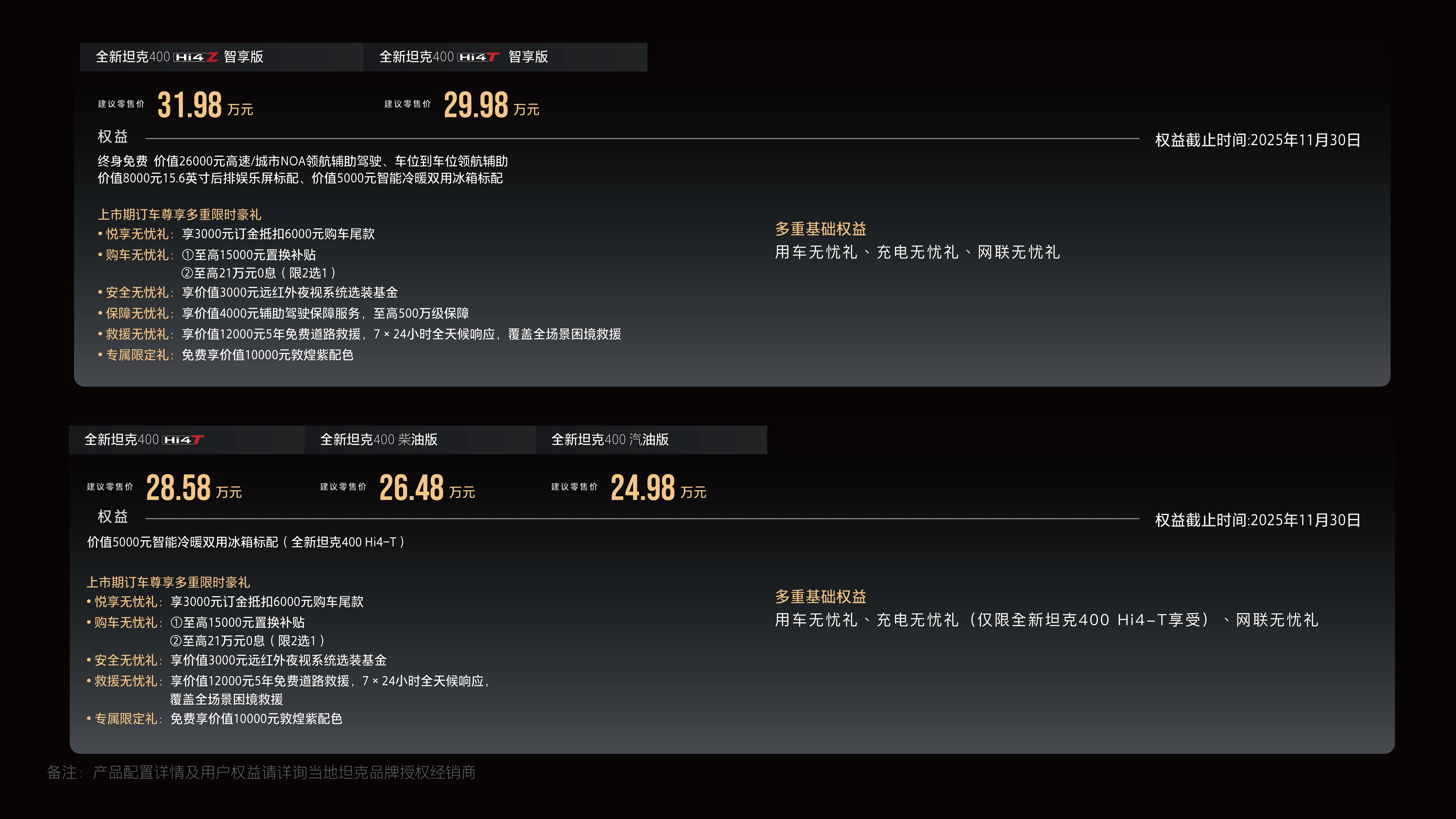 全新坦克400 Hi4-Z智享版,售價(jià)31.98萬元;全新坦克400 Hi4-T智享版,售價(jià)29.98萬元;全新坦克400 Hi4-T,售價(jià)28.58萬元;全新坦克400 柴油版,售價(jià)26.48萬元;全新坦克400 汽油版,售價(jià)24.98萬元。即刻下單可享多重尊崇權(quán)益,坦克以滿滿誠意為用戶帶來驚喜購車優(yōu)惠。
