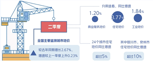 中國(guó)國(guó)土勘測(cè)規(guī)劃院日前發(fā)布的全國(guó)主要城市地價(jià)監(jiān)測(cè)報(bào)告顯示,二季度全國(guó)總體地價(jià)增速微漲。全國(guó)主要監(jiān)測(cè)城市地價(jià)較去年同期增長(zhǎng)2.67%,增速較上一季度上升0.23%。