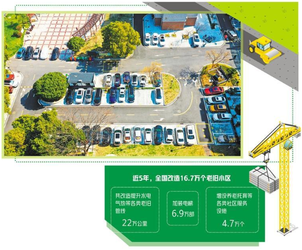 近年來(lái),老舊小區(qū)改造取得積極進(jìn)展。住房和城鄉(xiāng)建設(shè)部最新統(tǒng)計(jì)數(shù)據(jù)顯示,近年來(lái),各地在老舊小區(qū)改造中,共改造提升水電氣熱等各類老舊管線22萬(wàn)公里,加裝電梯6.9萬(wàn)部,增設(shè)停車位240萬(wàn)個(gè)、電動(dòng)汽車充電樁6.8萬(wàn)個(gè),增設(shè)養(yǎng)老托育等各類社區(qū)服務(wù)設(shè)施4.7萬(wàn)個(gè)。