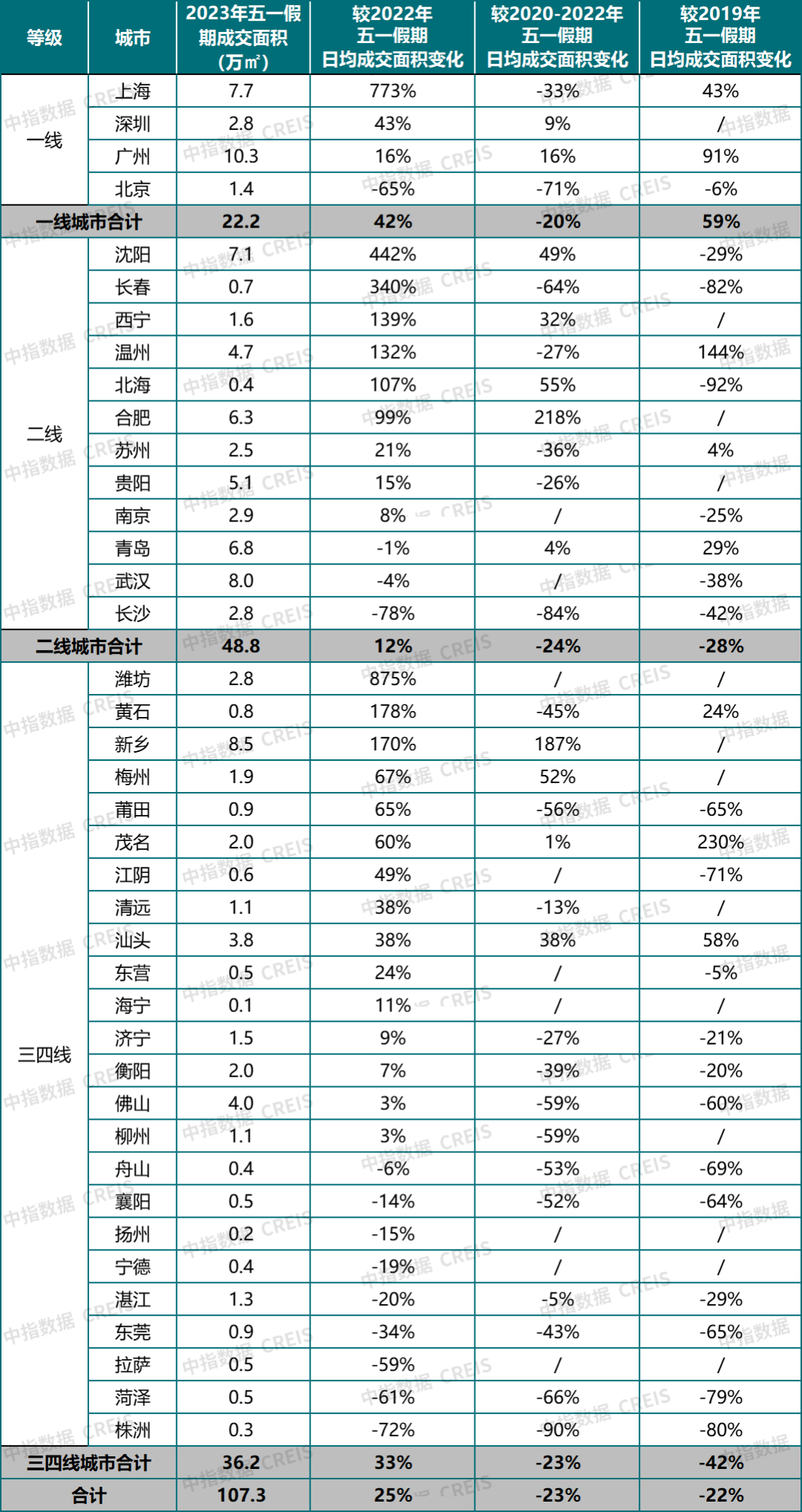 (2023年“五一”假期代表城市新建商品住宅成交情況,圖源:中指研究院,央廣網(wǎng)發(fā))