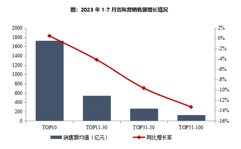 2023年1-7月,百億以上陣營企業(yè)數(shù)量減少。具體來看,千億以上陣營10家,與去年同期持平,銷售額均值1725.5億元。第二陣營(500-1000億)企業(yè)7家,較去年同期減少4家,銷售額均值785.8億元。第三陣營(300-500億)企業(yè)20家,較去年同期增加1家,銷售額均值383.5億元。第四陣營(100-300億)企業(yè)為48家,較去年同期減少3家,銷售額均值171.0億元。