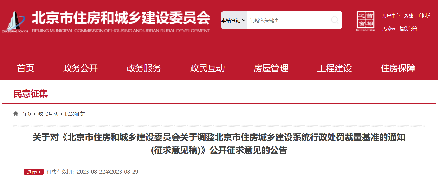 央廣網(wǎng)北京8月23日消息 據(jù)北京市住房和城鄉(xiāng)建設(shè)委員網(wǎng)站消息,為貫徹落實《建設(shè)工程質(zhì)量檢測管理辦法》《房地產(chǎn)開發(fā)企業(yè)資質(zhì)管理規(guī)定》相關(guān)處罰職權(quán),北京市住房和城鄉(xiāng)建設(shè)委員會制定了《北京市住房和城鄉(xiāng)建設(shè)委員會關(guān)于調(diào)整北京市住房城鄉(xiāng)建設(shè)系統(tǒng)行政處罰裁量基準(zhǔn)的通知(征求意見稿)》,現(xiàn)向社會公開征求意見。公開征集意見時間為:2023年8月22日至8月29日。