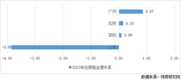 (二)一線城市微漲為主,二三線城市下跌居多 多數(shù)一線城市住房租金微漲,個別租金下跌。一線城市中,廣州、北京和深圳2023年住房租金分別上漲0.87%、0.15%和0.09%。上海住房租金下跌3.85%。