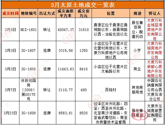 3月份,太原共5宗用地成交,除南沙河南岸一宗商住用地被太原龍城南部置業(yè)有限公司摘得以及一宗國有土地使用權(quán)轉(zhuǎn)讓以外,其余3宗均被萬科摘得,成為本月土地市場的最大看點(diǎn)。