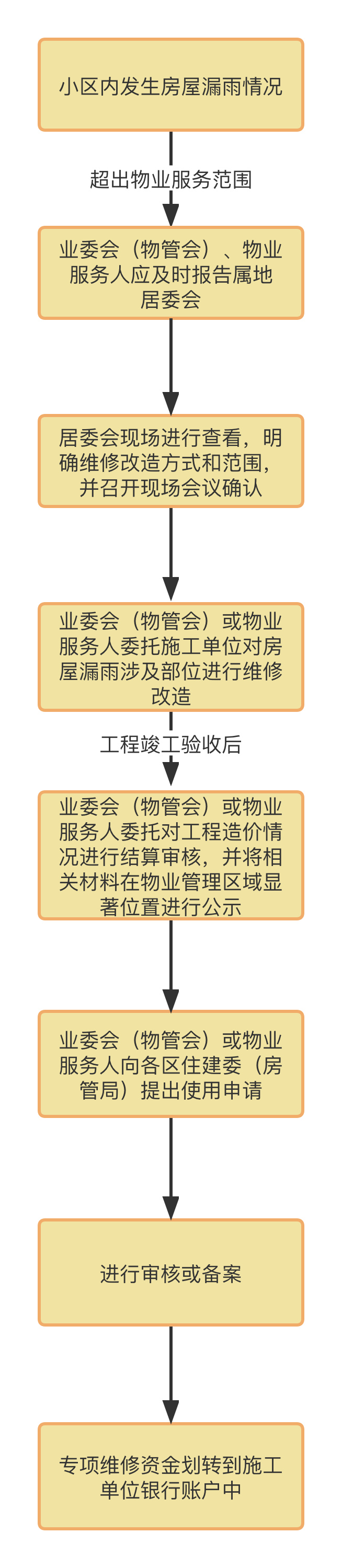 由屬地居(村)民委員會召集業(yè)委會(物管會)、物業(yè)服務(wù)人及相關(guān)業(yè)主等共同到現(xiàn)場對漏雨情況進行實地查看,明確維修改造方式和范圍,并召開現(xiàn)場會議確認(rèn)。