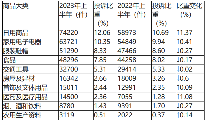 根據2023年上半年商品大類投訴數(shù)據,日用商品類、家用電子電器類、服裝鞋帽類、食品類和交通工具類投訴量居前五位。與2022年上半年相比,日用商品類、醫(yī)藥及醫(yī)療用品類投訴比重上升明顯,房屋及建材類投訴比重有所下降。